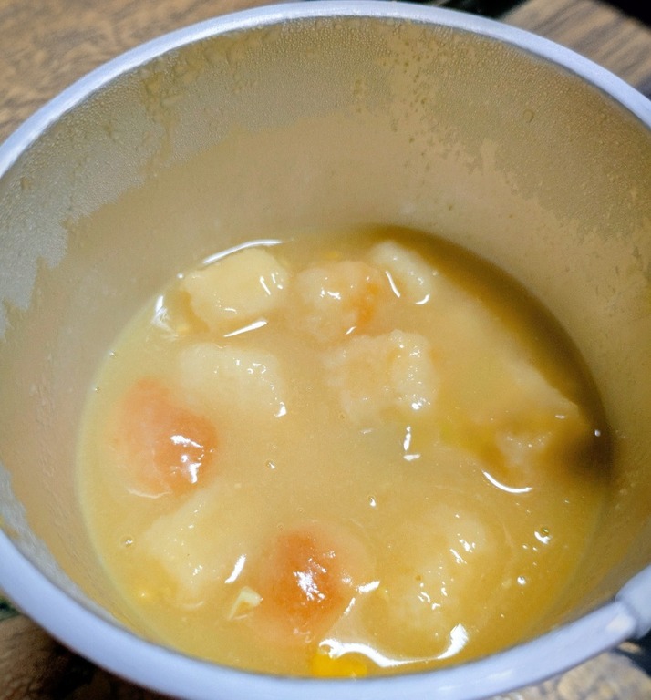 小腹がすいた時にパンのボリュームがありがたい。なかなか熱湯でも溶けずダマになるので、念入りに混ぜているうちにパンがフニャフニャになってしまうのが惜しい。