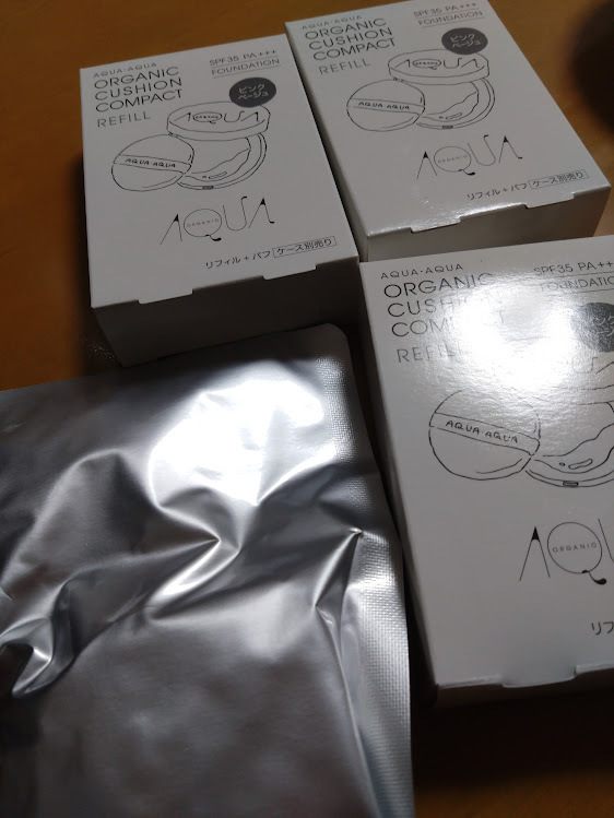 以前もこちらでアクアアクアさんのクッションファンデを購入しました。その時家族に大好評だったので、また購入させていただきました。かなりの敏感肌なのですが、これは全然大丈夫でした。3個セットなので母と妹にもプレゼントしました。