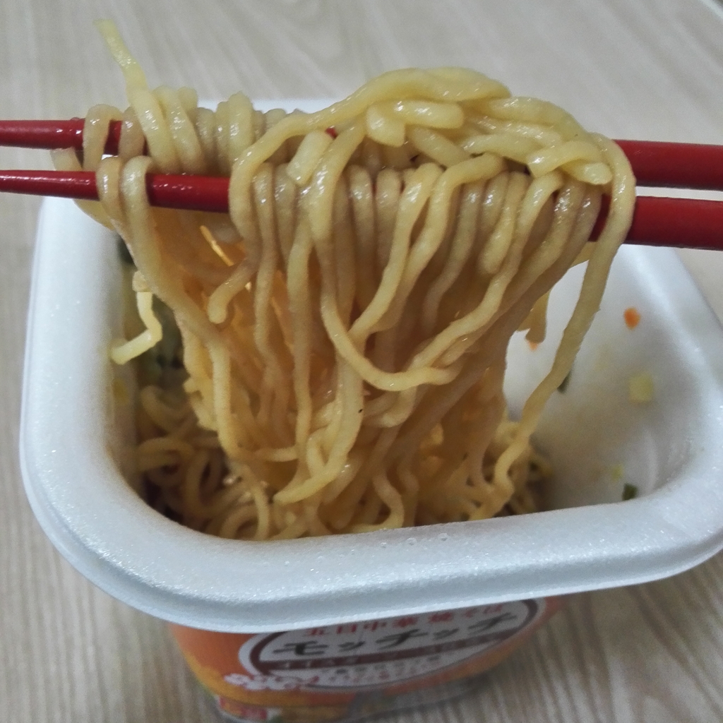 見た目はカップ焼きそばにしては小ぶりに見えます。でも、オイスターソースの味が濃厚。キャベツ、きくらげ、にんじん野菜シャキシャキ。麺がもちもちなので、食べごたえ十分です。満足感ありです。