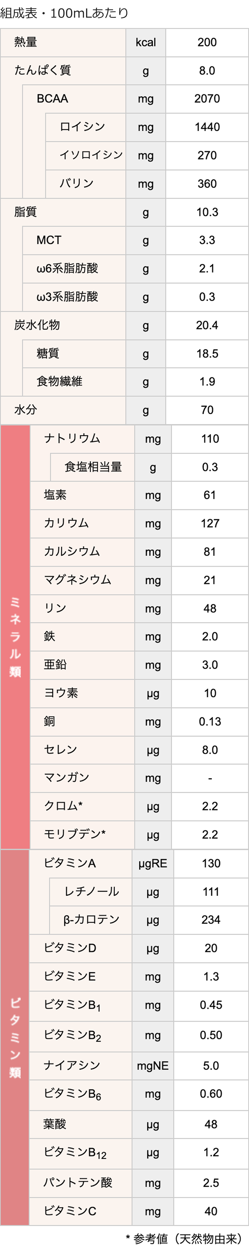 たんぱく質 8g、必須アミノ酸 3635mg、BCAA 2070mg、ロイシン 1440mg