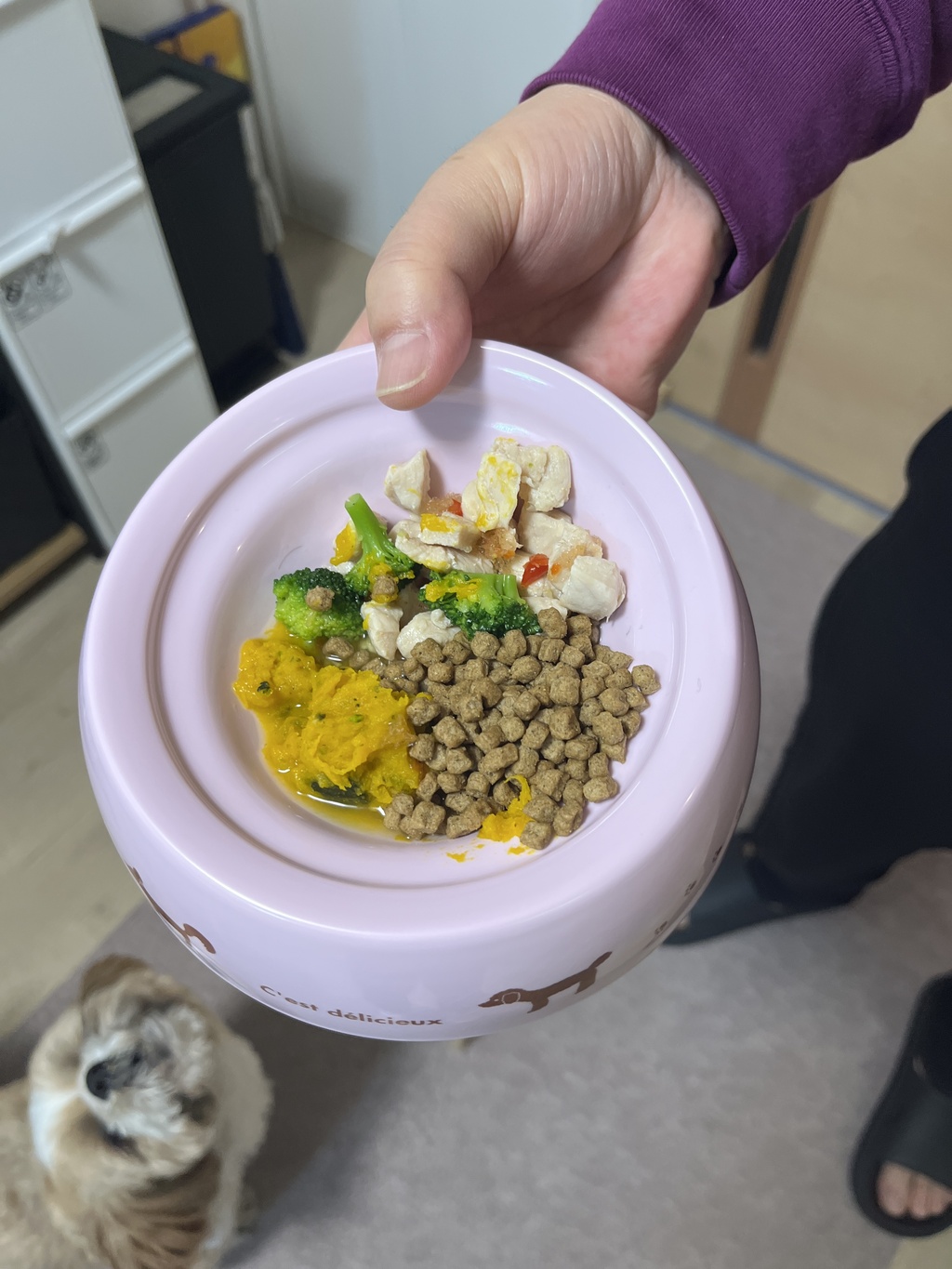 豚肉と鶏肉をミックスしたミートローフと消化にやさしい温野菜。