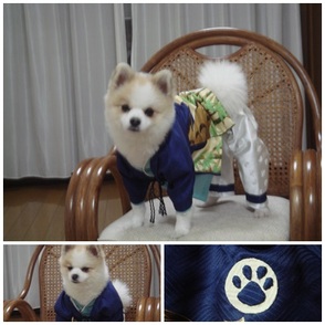 お友達のわんこに「羽織はかま」を作りました。 羽織には「手形」の紋があります。 ごきげんで(?)着てくれました。 初詣では注目の的でしたよ。