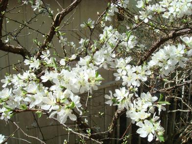 日当たりの悪い我が家の中庭にも、ようやく春がやって来ました。「ゆすら梅」の清楚な白い花が好きです。