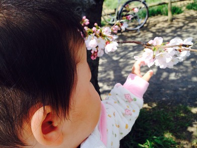 8月生まれの娘にとって初めての桜です。 綺麗な桜に興味津々で一生懸命手を伸ばしていました。