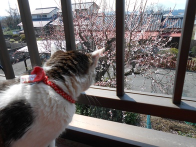 ベランダから外を見るのが好きなウチの猫です。 桜ではなく杏の花ですが綺麗に咲いてます。