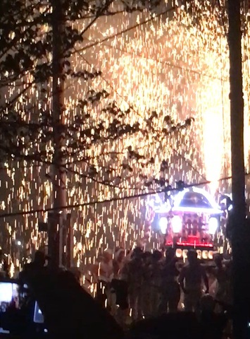 地元の神社で300年続いている火祭りに行ってきました。 火の粉が舞い散る中、鐘を打ち鳴らし、電飾と花火のついた神輿が通って行きます。 五穀豊穣、家内安全、健康祈願などなど。 行った後は運気が上がったのかちょっと元気になりました。