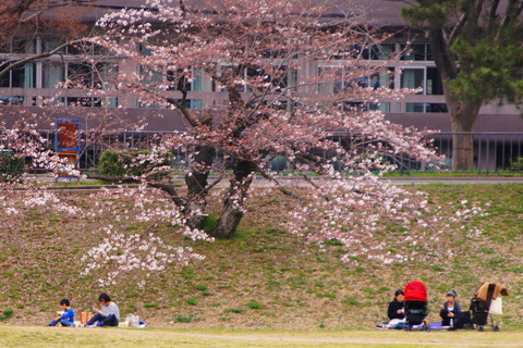 春の植物園横の賀茂川の堤防では、桜の元、幾組かの家族が、花見に寛いでいました。