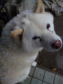 今年は元旦から雪です。 背中にうっすら雪が積もり おうちに入れて欲しーぞモードのワンコです。