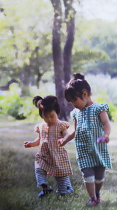 姉妹で公園をお散歩。まだ小さい妹を気にしながら。天気がよくて、新緑も気持ちのいい散歩日和です。