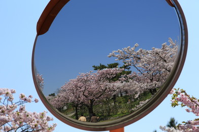 北海道ではGWに丁度満開となった桜。カーブミラーの中にまで写り込んでしまいました。