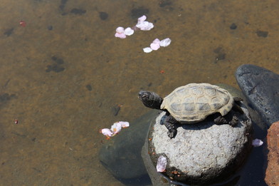 桜が満開となった松前公園の中にある池。ぽかぽか陽気にカメさんも目を細めて日向ぼっこ中です。甲羅がやや干からびちゃってますがw