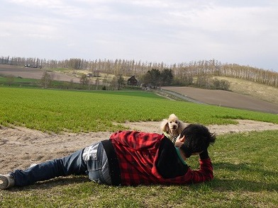 ゴールデンウィークは家族で、美瑛と富良野に行ってきました。 愛犬のだいちゃんも一緒です。 あまりの景色の良さにごろーん・・・ 早春の北海道気持ちいいです。