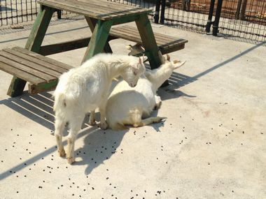 今年のゴールデンウィークは暑かったです。運動公園に行った時、やぎさんと遊ぼうと子供と近づいたら…イスの下に入ってしまいました。遊ぶ余裕はなさそうでした(笑)。