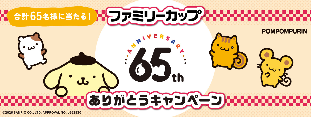 ※【ファミリーカップ65周年ありがとうキャンペーン】に関するお問い合わせは、ファミリーカップ65周年ありがとうキャンペーン事務局(familycup65th-cp@campar.jp)までお願いいたします。